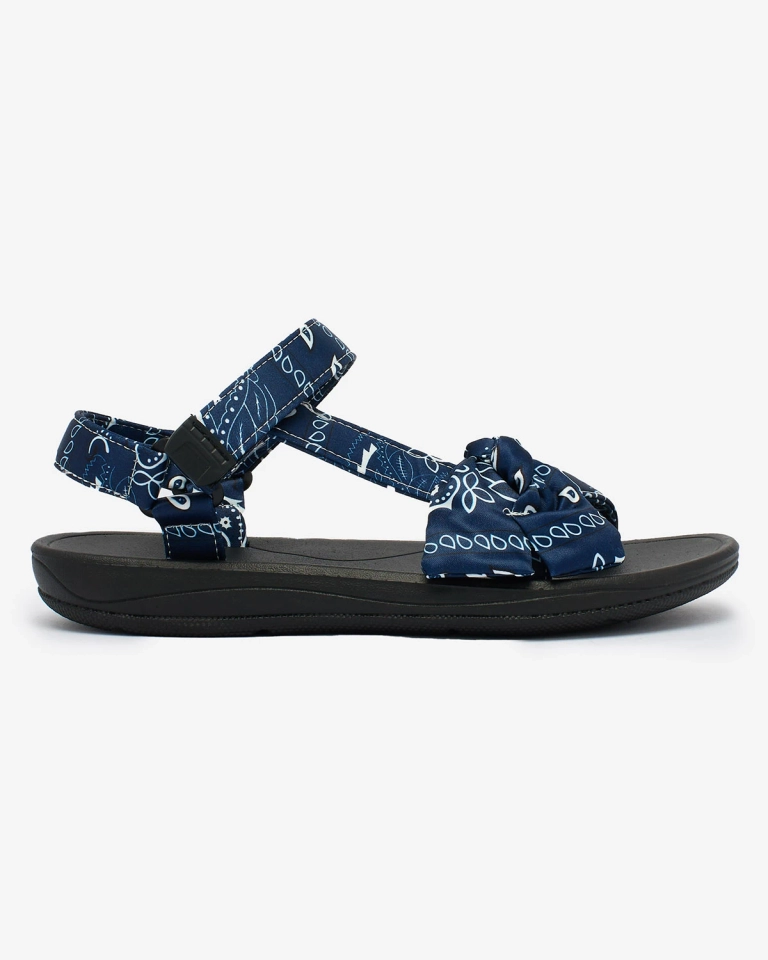 - Sandale sport pentru femei cu talpă de cauciuc. Curelele sunt confecționate din material textil cu imprimeu și decorate cu o fundă. Pantofii de damă prezentați sunt fixați cu curele Velcro. Aderă bine la picior!