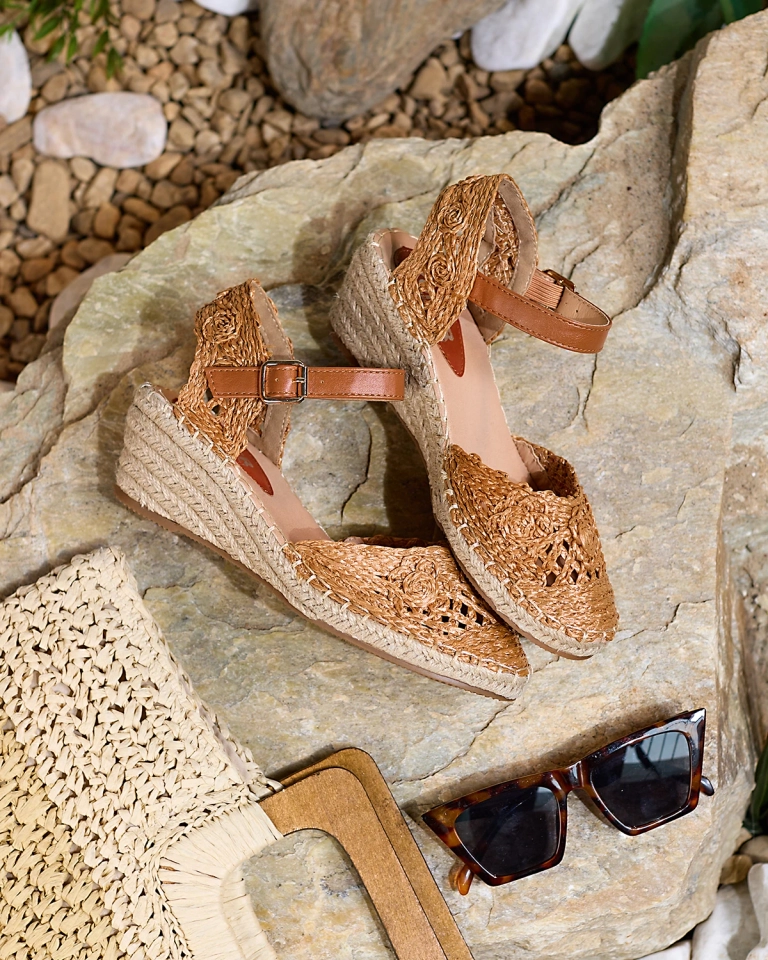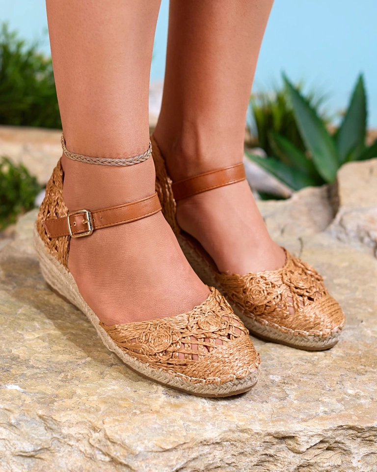 - Sandale împletite pe tocuri pentru femei, confecționate din material textil și talpă din piele ecologică. Modelul cu toc deschis, are o închidere cu cataramă și o talpă decorată cu cordon de iută. Perfecte pentru crearea unor ținute originale!