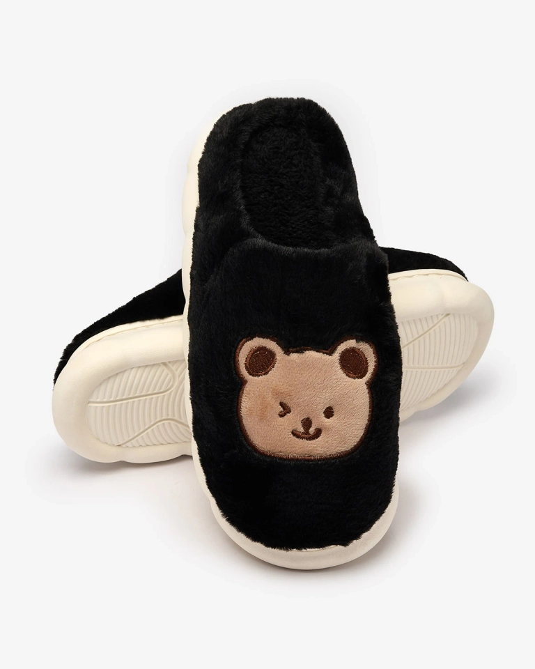 • Papuci unici pentru femei cu talpă plată, decorați cu un petic de ursuleț de pluș. Modelul este confecționat din material care imită blana. O opțiune excelentă pentru ținutele de acasă!