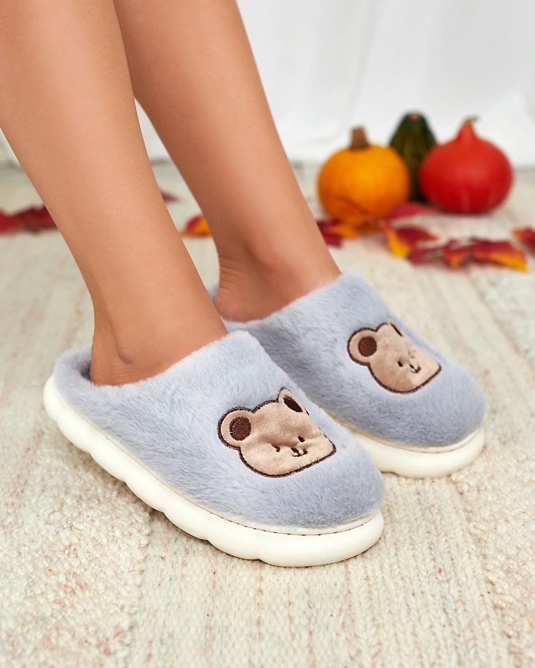 - Papuci unici pentru femei cu talpă plată, decorați cu un petic de ursuleț de pluș. Modelul este confecționat din material care imită blana. O opțiune excelentă pentru ținutele de acasă!