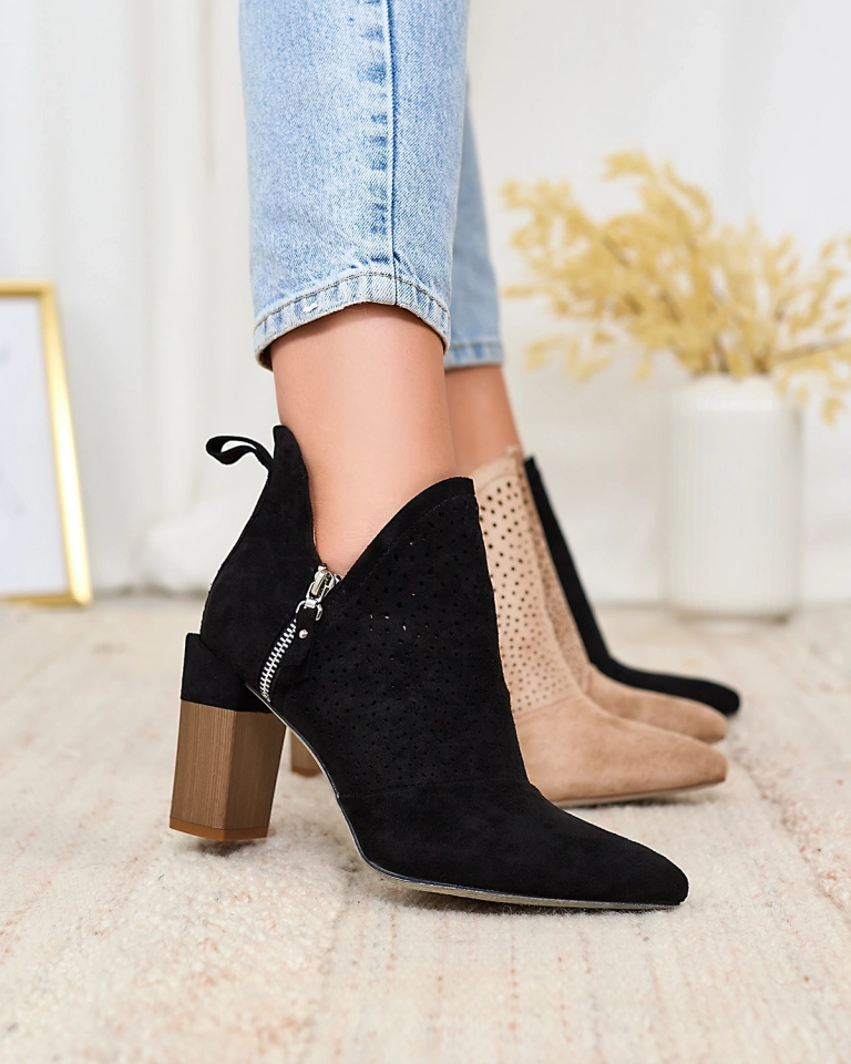 - Cizmele stiletto mai înalte sunt o combinație de eleganță și confort. Partea superioară cu fermoar, confecționată din piele eco-suede cu finisaj ajurat. Talpa din piele ecologică asigură confort în timpul purtării. Modelul este decorat cu finisaj ajurat ș