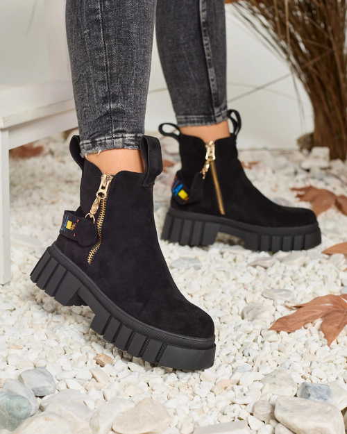- Cizme elegante cu talpă mai groasă, realizate din piele ecologică de sued. Bot rotunjit, centru umplut cu blană. Încălțăminte încheiată cu fermoar. Modelul are un fermoar decorativ și curea detașabilă. Încălțăminte excelentă pentru ținutele elegante de to