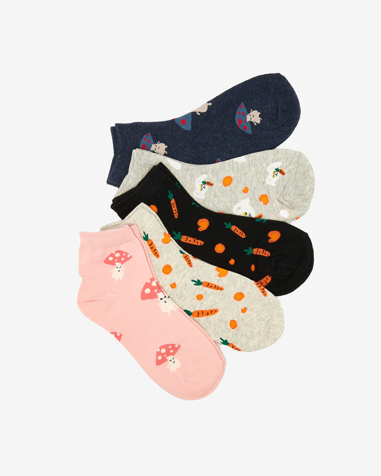 • Set de șosete înalte pentru femei 5/pachet, confecționate din material plăcut din bumbac finisat cu imprimeu colorat. Se potrivesc perfect piciorului, oferind libertate de mișcare și confort zilnic.