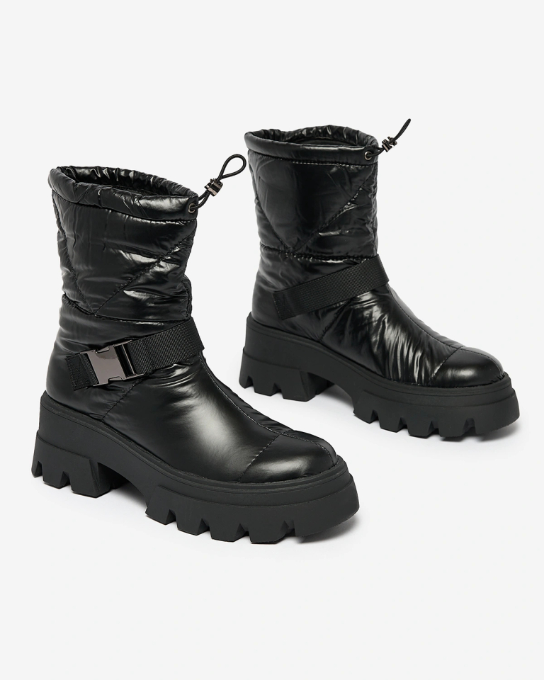 - Cizme de zăpadă de damă cu partea superioară din material oilcloth a'la. În interior o talpă din material textil, pantofi slip-on. Modelul are o bordură la capătul feței și o cataramă decorativă. Elegant și confortabil!