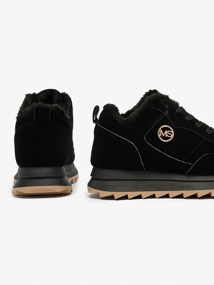 • Pantofi sport de damă călduroși, cu talpă groasă. Partea superioară cu șireturi este confecționată din nubuc ecologic. Interiorul este căptușit cu blană moale. Un plus excelent pentru ținutele tale casual de iarnă!
