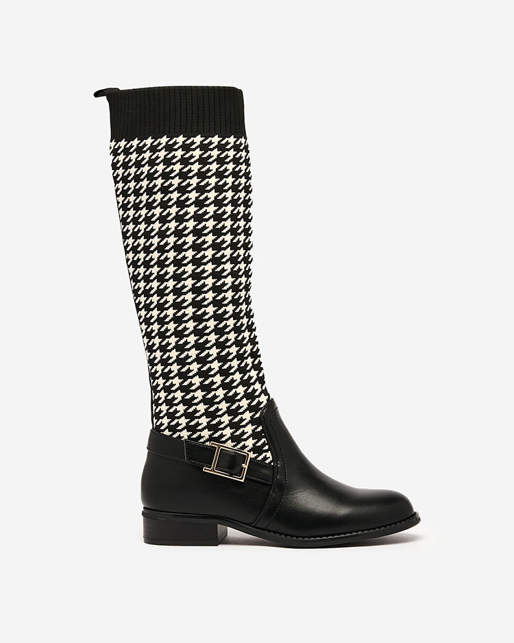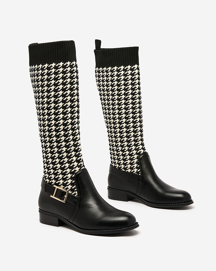 - Cizme înalte de damă confecționate dintr-o combinație de piele ecologică și țesătură elastică. Model slip-on, decorat cu un model pepit, izolat la interior cu o talpă a'la blană. Tocul plat adaugă confort și comoditate. O alegere excelentă pentru toamnă!