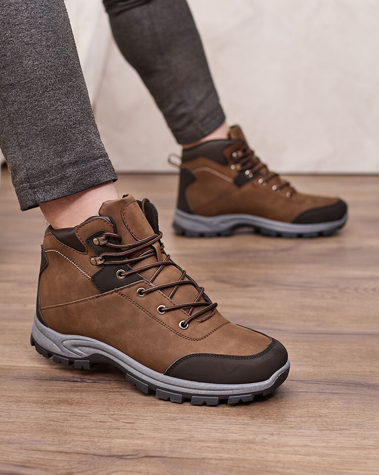 • Trapperi de trekking pentru bărbați cu partea superioară cu șiret. Materialul de construcție este piele ecologică mată, mijlocul pantofilor este izolat cu spumă subțire. Ideali pentru perioada de iarnă!
