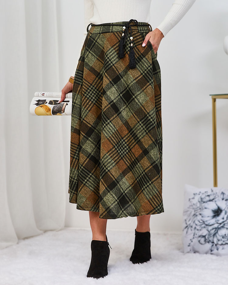 - Fustă midi de damă realizată din material moale în carouri. Modelul are în plus o curea legată cu perle și două buzunare. Baza perfectă pentru multe ținute unice! NOTĂ: Precizia măsurătorilor (+/-) 1 cm.
