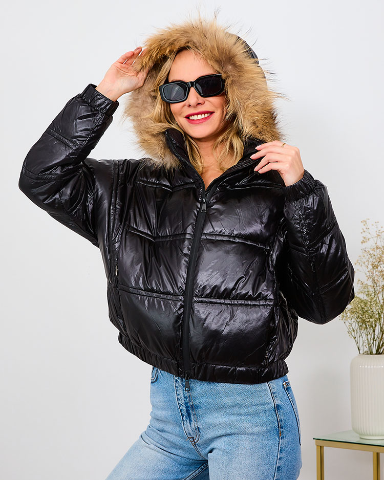 • Jachetă scurtă pentru femei, confecționată din material a'la cerata:- glugă detașabilă cu blană- buzunare pe laterale- jachetă matlasatăModel ideal pentru toamnă!