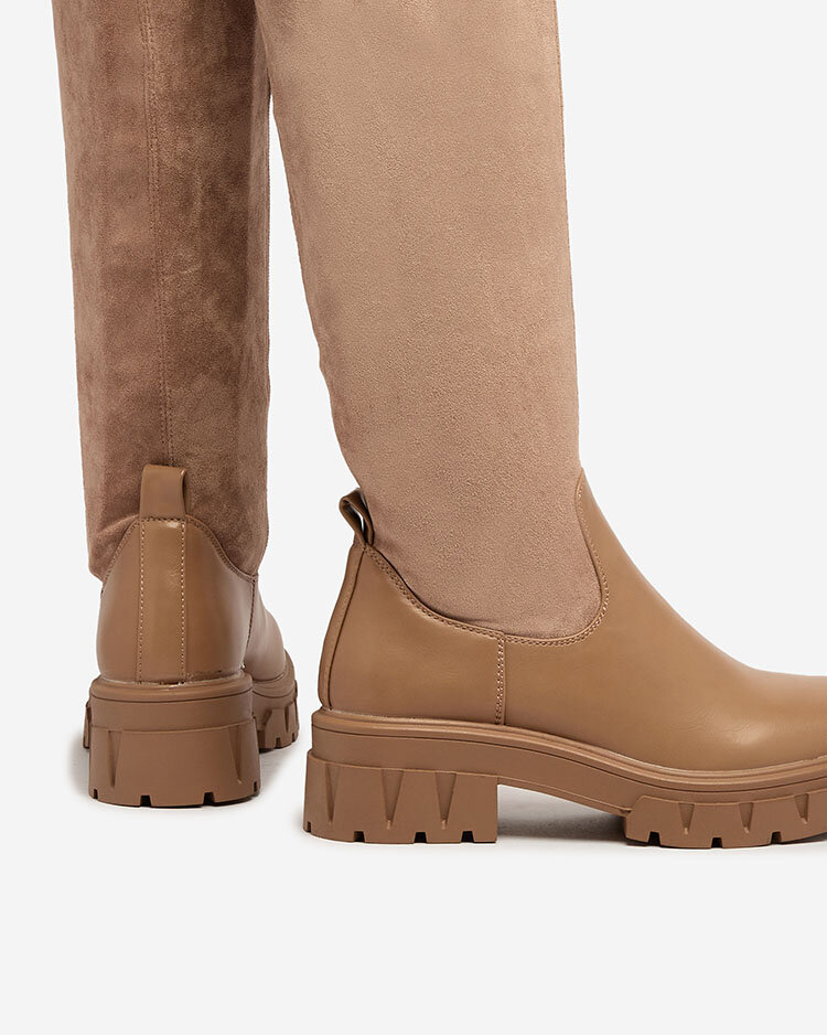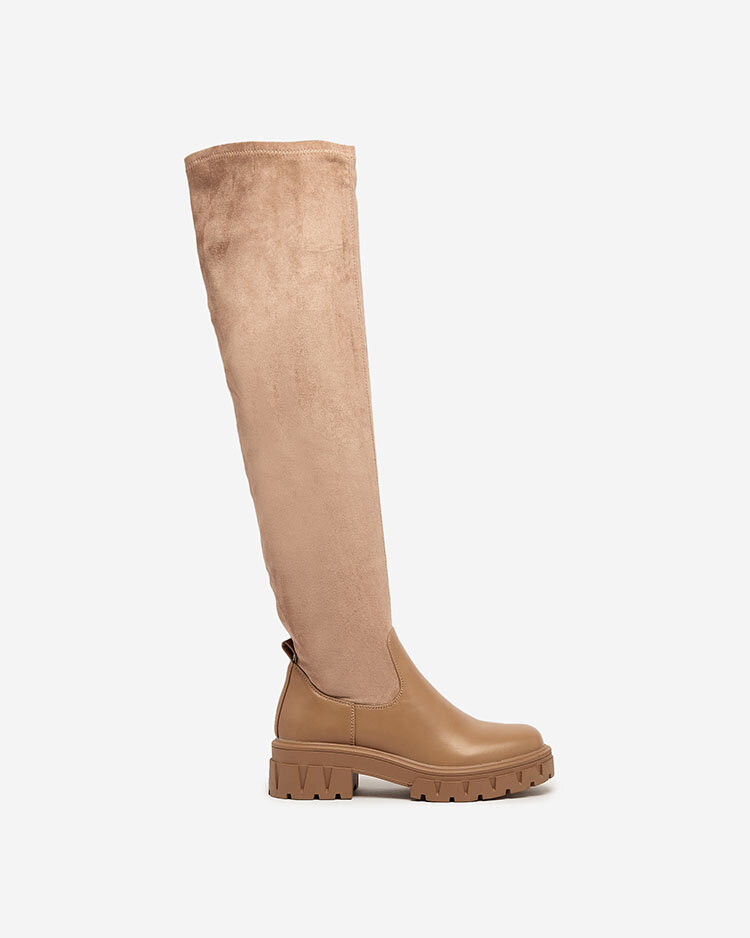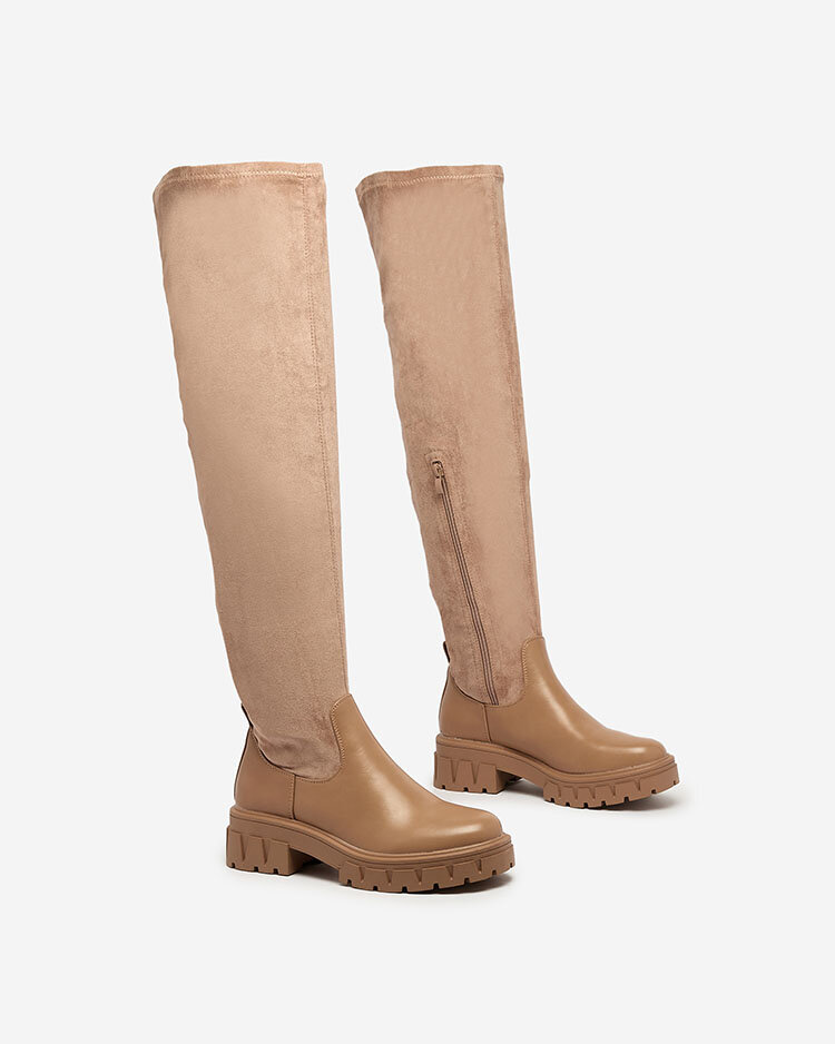 - Cizme elegante peste genunchi pentru femei cu talpă mai groasă. Partea superioară este confecționată din piele ecologică de căprioară și are inserții din piele ecologică. Talpă din material textil. Model slip-on.