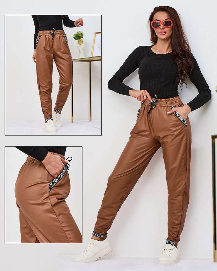 - Pantaloni lejere pentru femei, din piele ecologică. Modelul are talie elastică extensibilă, pantaloni și 2 buzunare glisante. Un hit al acestui sezon! NOTĂ: Precizia măsurătorilor (+/-) 1 cm.