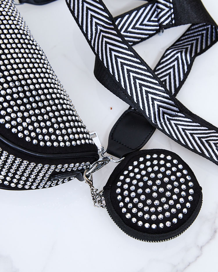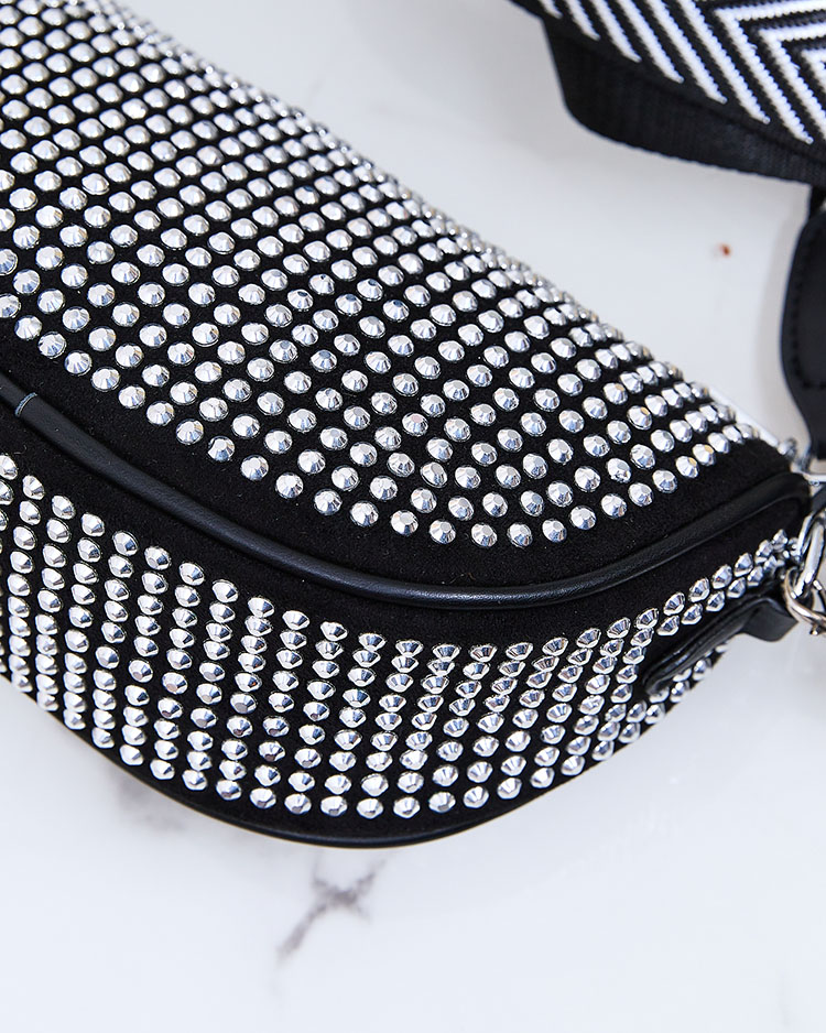 - Geantă mică pentru femei din piele ecologică de căprioară cu pietre decorative strălucitoare. Geanta are 1 compartiment și 1 buzunar interior. În plus, o curea detașabilă, reglabilă și o husă. Modelul este prevăzut cu fermoar.