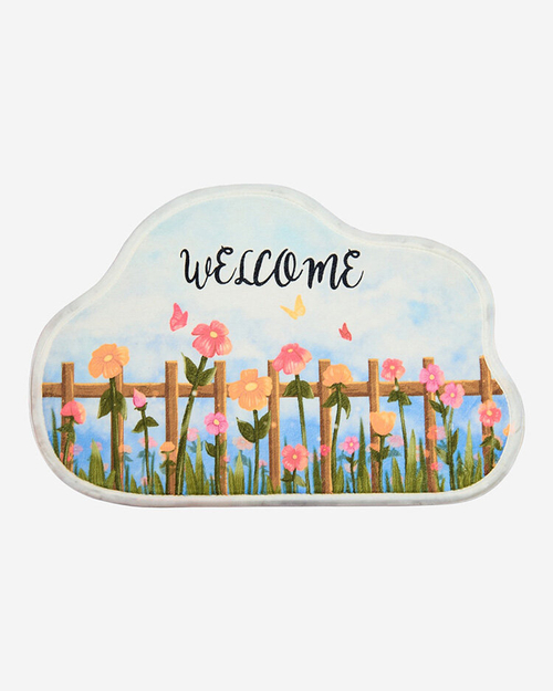 - Covoraș mic și colorat cu păr scurt și inscripția "Welcome Home". Este moale și delicat, ceea ce îl face extrem de plăcut la atingere. Un avantaj suplimentar al covorașului este partea inferioară antiderapantă.