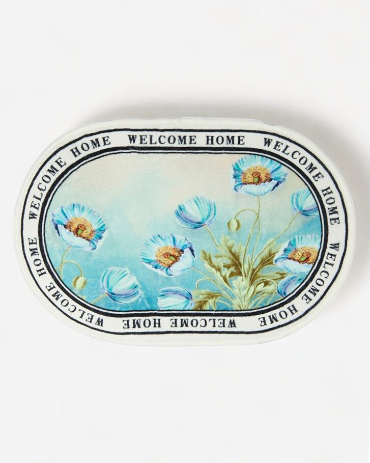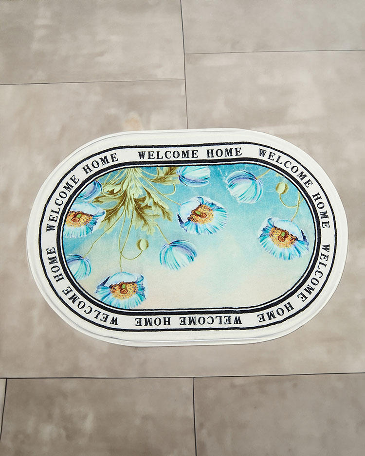 - Covoraș mic și colorat cu păr scurt și inscripția "Welcome Home". Este moale și delicat, ceea ce îl face extrem de plăcut la atingere. Un avantaj suplimentar al covorașului este partea inferioară antiderapantă.