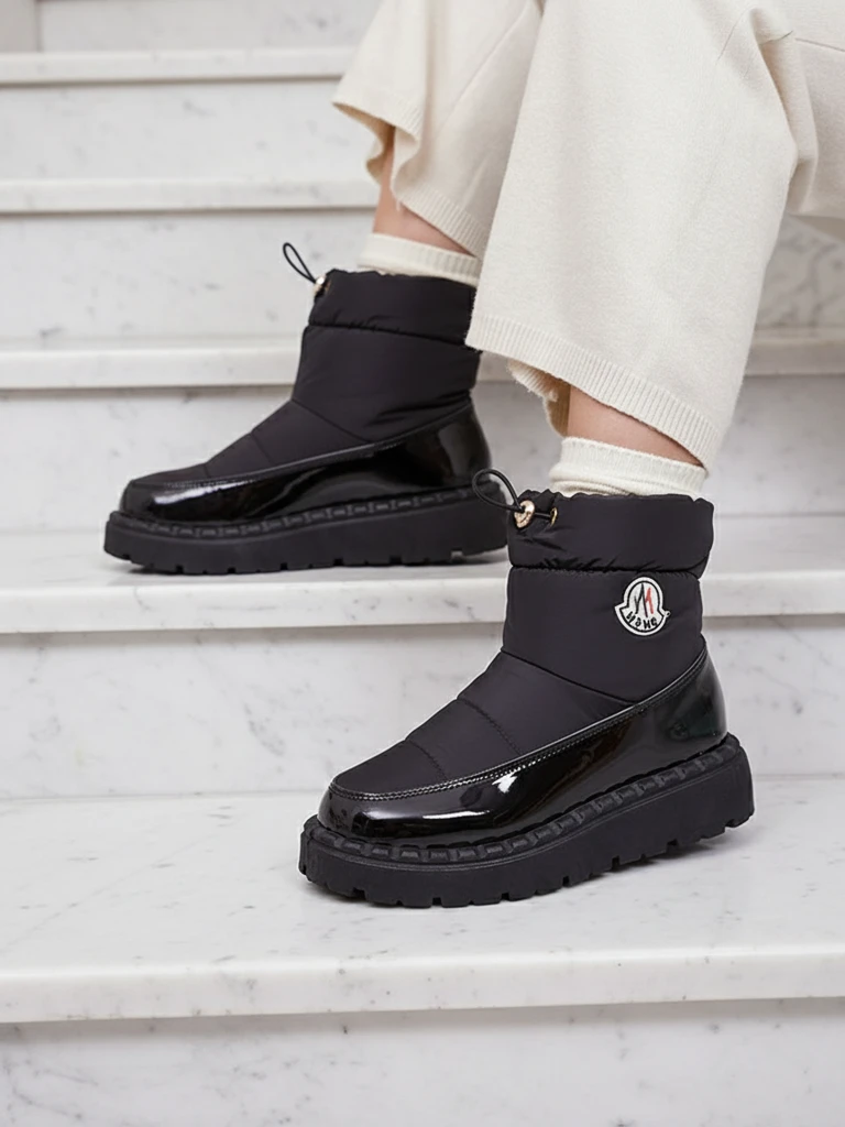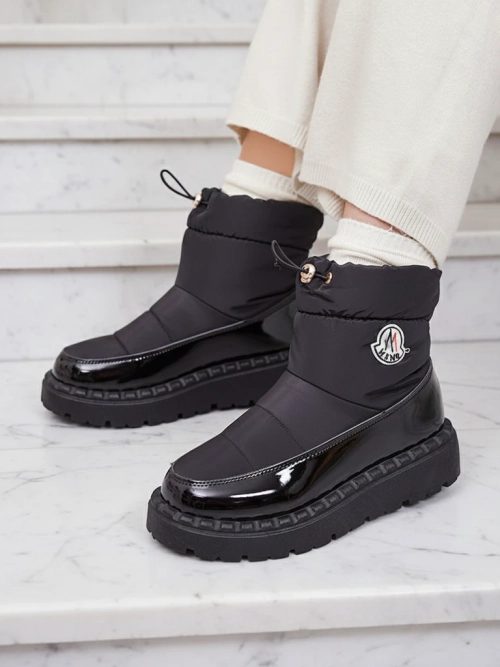 - Cizme de zăpadă slip-on atemporale pentru femei. Model cu partea superioară realizată din material de pânză de ulei a'la și inserții din piele ecologică lăcuită. Izolați în interior sub formă de blană, pantofii alunecă și au o talpă. Perfecți pentru sezon