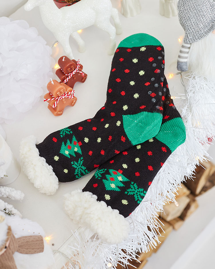• Șosete groase frumoase pentru femei, finisate cu un model de Crăciun, cu partea inferioară antiderapantă. Interior izolat cu piele de oaie caldă albă. Șosetele vor fi minunate pentru serile mai reci.