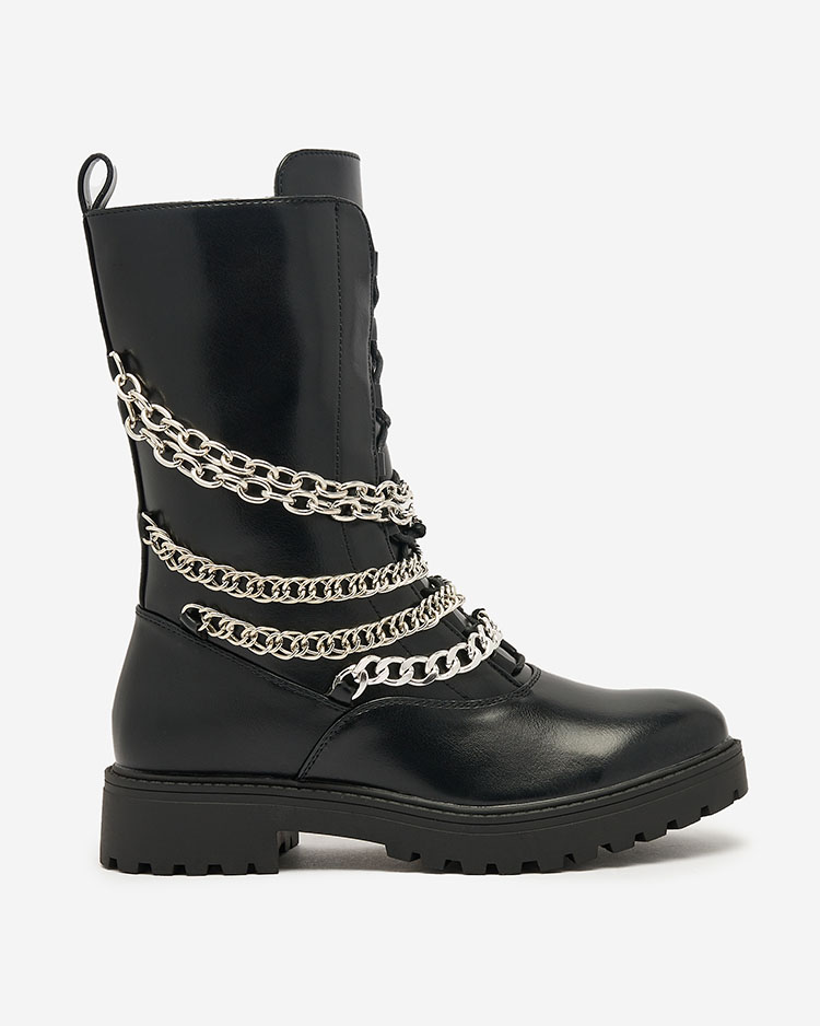 • Cizme bagger de damă cu talpă solidă. Partea superioară este confecționată din piele ecologică, decorată cu lanțuri și izolată cu blană în interior. Model cu șireturi și fermoar pe lateral. O alegere excelentă pentru zilele mai reci!