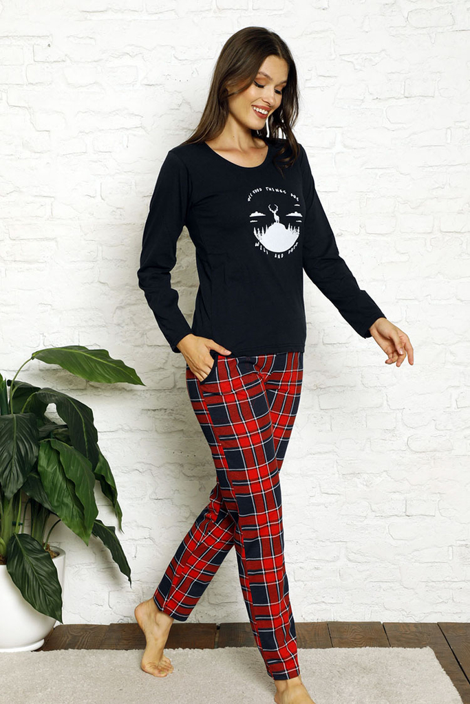 - Pijama de damă din țesătură de bumbac. Model decorat cu un imprimeu, pantaloni în carouri. Cadou perfect pentru Crăciun! NOTĂ: Precizia măsurătorilor (+/-) 1 cm.