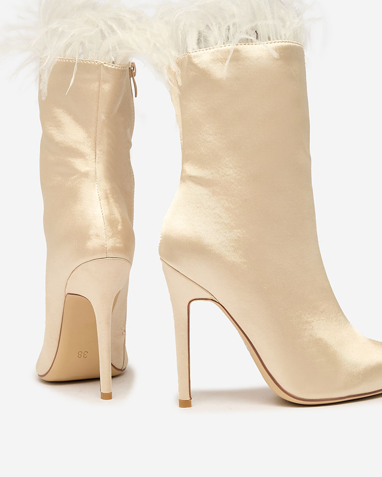 - Cizme elegante cu toc stiletto, realizate din țesătură a'la satin. Botul se termină într-un vârf ascuțit. Pe partea laterală fermoar și decor sub formă de pene la capătul părții superioare. Pantofi excelenți pentru creațiile de toamnă!