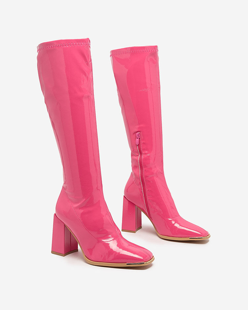 - Cizme elegante pentru femei, cu postament și vârf până la genunchi. Partea superioară este confecționată din piele lăcuită și are o talpă din material textil. Model cu fermoar și nas pătrat. Perfecte pentru crearea unor ținute elegante!
