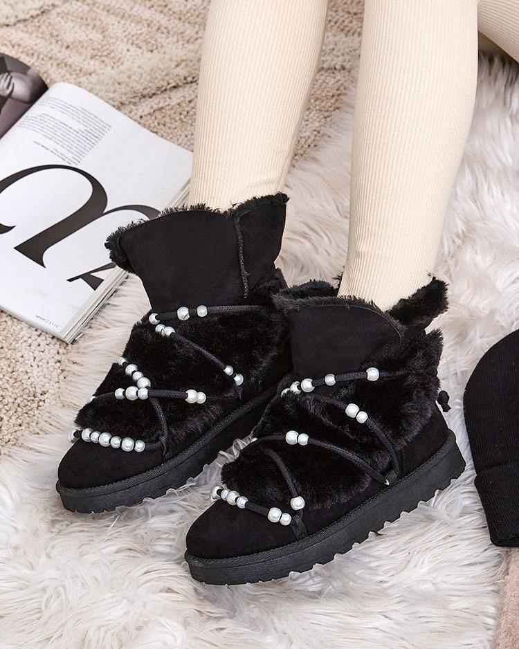 - Cizme de iarnă pentru femei încălzite, cu toc plat. Partea superioară cu șireturi, decorată cu perle, este realizată dintr-o combinație de eco-nubuc și blană. Baza perfectă pentru iarnă!