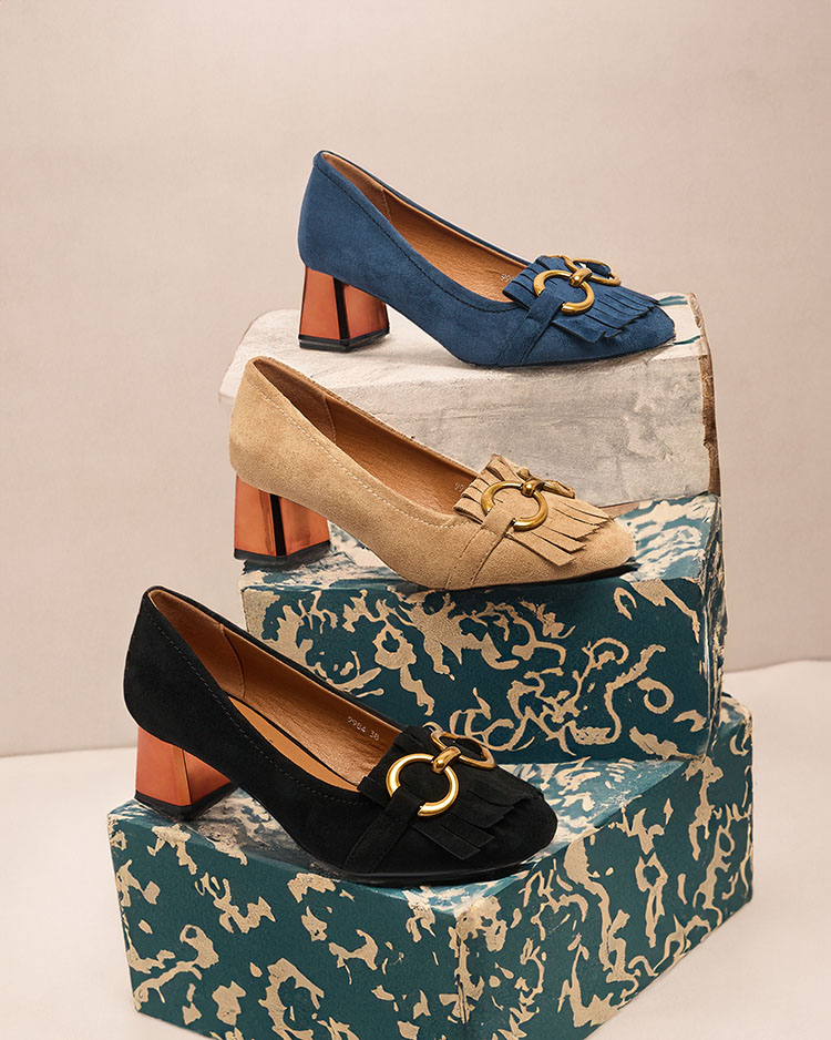 • Pantofi frumoși pentru femei cu toc jos, cu sclipici. Partea superioară este confecționată din piele de căprioară ecologică, în timp ce mijlocul este căptușit cu piele ecologică, nasul rotund decorat cu o cataramă și ciucuri. Acești pantofi vor adăuga ele