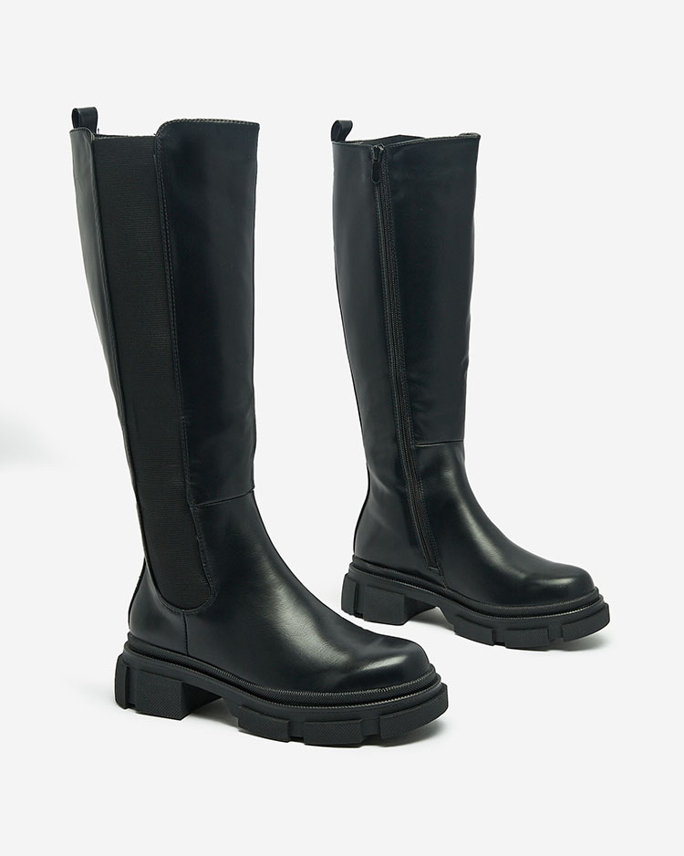 - Cizme de damă la jumătatea gambei, realizate din piele ecologică cu talpă din material textil. Model pe toc plat. Inserții decorative din țesătură pe bot și pe călcâi. Încălțăminte cu fermoar și inserție elastică pe lateral.