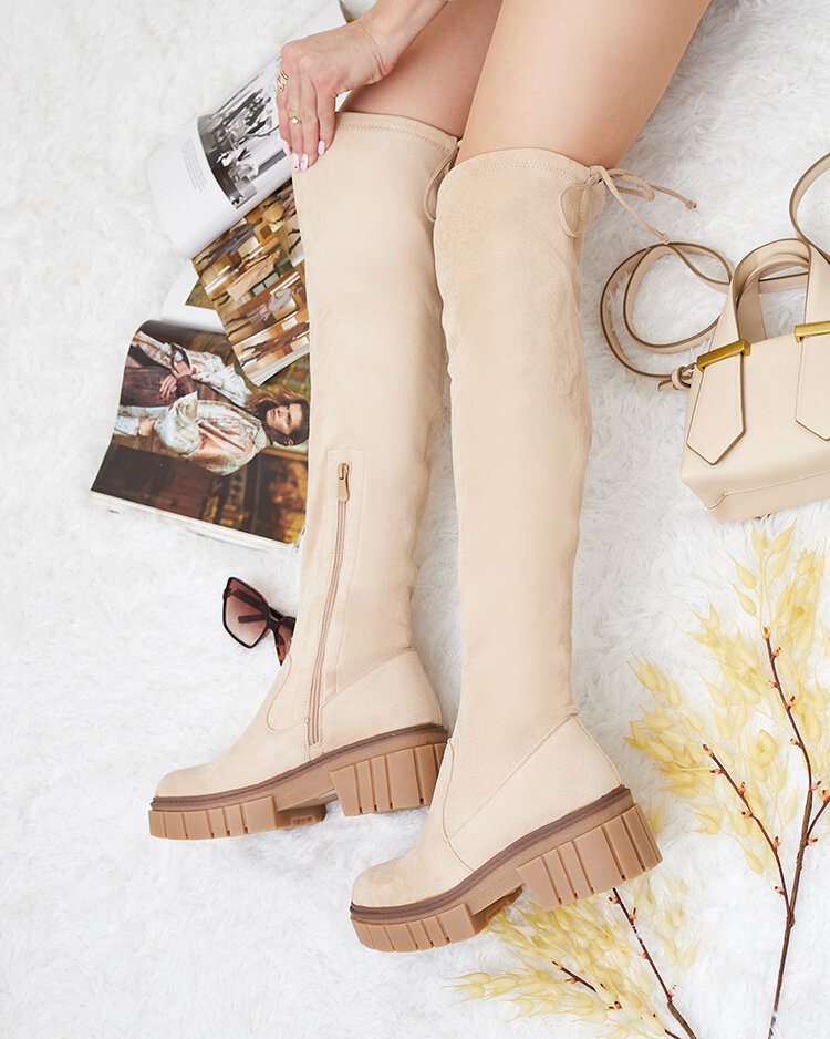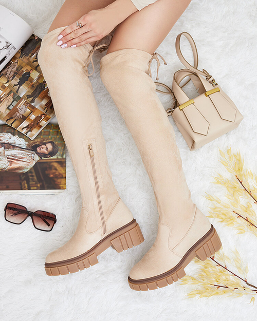 - Cizme lungi de damă cu talpă mai groasă, partea superioară din piele ecologică. Modelul are o talpă din blană. Cizmele au fermoar până la mijlocul vițelului și sunt prevăzute cu o bordură. Baza perfectă pentru multe ținute de iarnă!