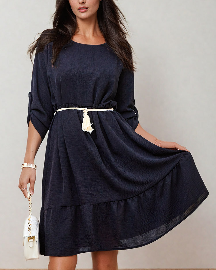 - Rochie casual de damă până la genunchi, cu mâneci lungi, rulate și decolteu rotund. Plus o curea inclusă. Must have al acestui sezon! NOTĂ: Precizia măsurătorilor (+/-) 1 cm. Dimensiuni măsurate în poziție plată.