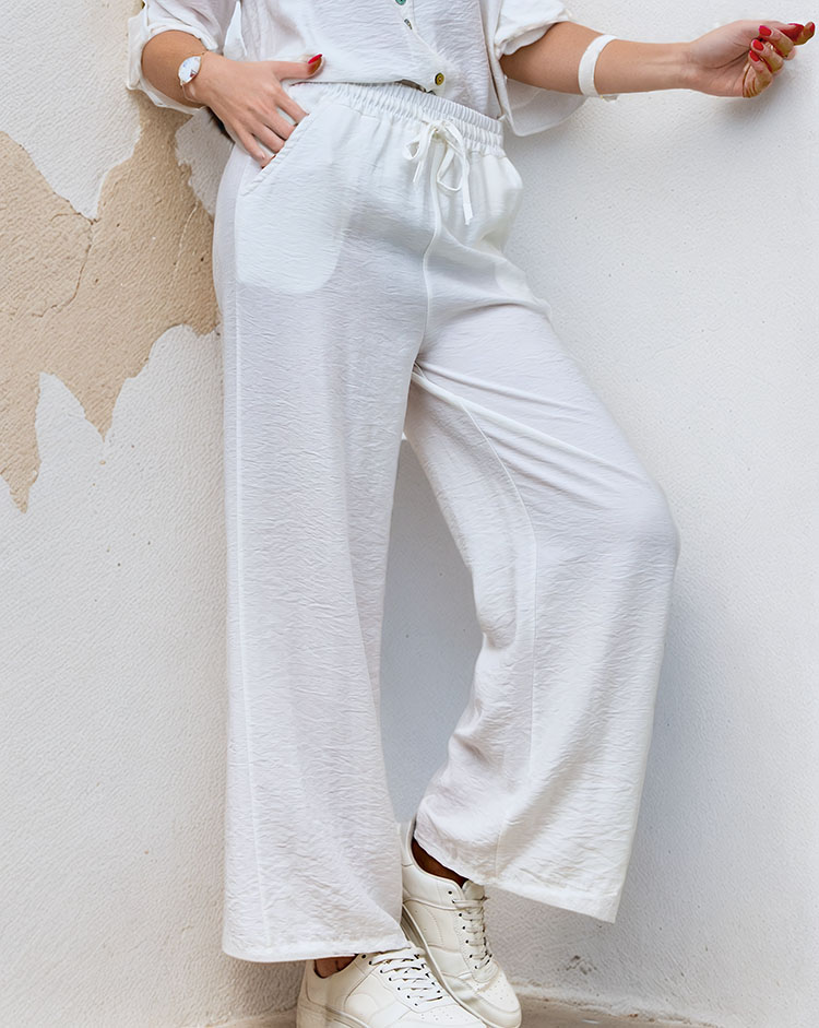 - Set casual pentru femei din material plăcut. Cămașă cu mâneci lungi rulate, cu nasturi. Pantaloni largi cu talie elastică, 2 buzunare și cravată.