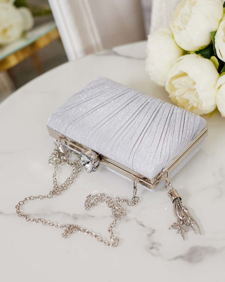 • Geantă mică elegantă pentru femei, decorată cu fir de sclipici. Model cu închidere cu clichet din pietre prețioase, are 1 compartiment și 1 buzunar. În plus, lanț de umăr detașabil și breloc de chei. Perfectă pentru ieșirile formale!
