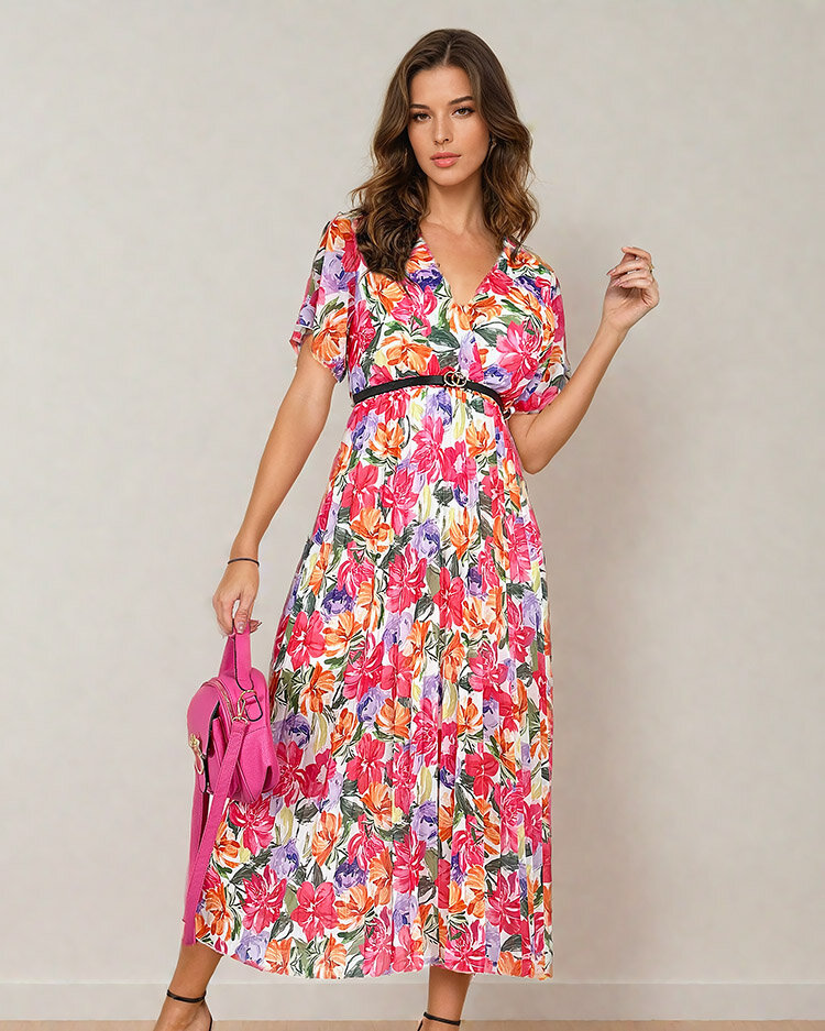 • O rochie de damă unică, realizată din material ușor, cu model floral. La înălțimea taliei are o bandă elastică. Produsul are o lungime midi, are mâneci scurte și ornamente plisate. În plus, este inclusă o curea. Simțiți vara în acest model!