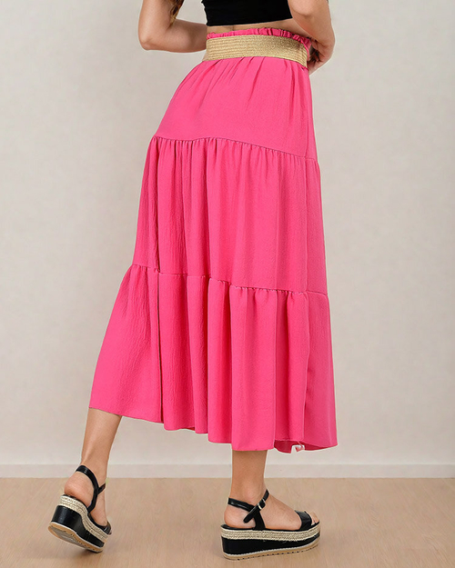 • Fustă de damă de lungime midi atemporală. Modelul are o centură elastică, care evidențiază perfect talia. În plus, este inclusă o curea împletită. Această fustă este un accent deosebit pentru look-ul dvs. de zi cu zi!
