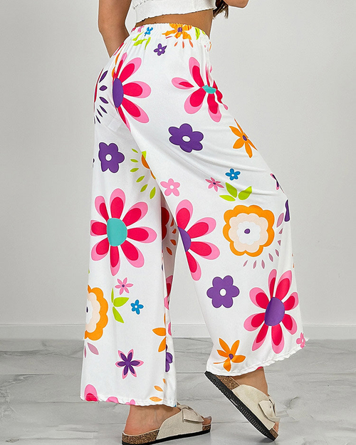- Pantaloni largi cu model floral pentru femei. Model cu talie medie, cu bandă elastică și cravată în talie, are buzunare în față. Modă și confort într-unul singur!