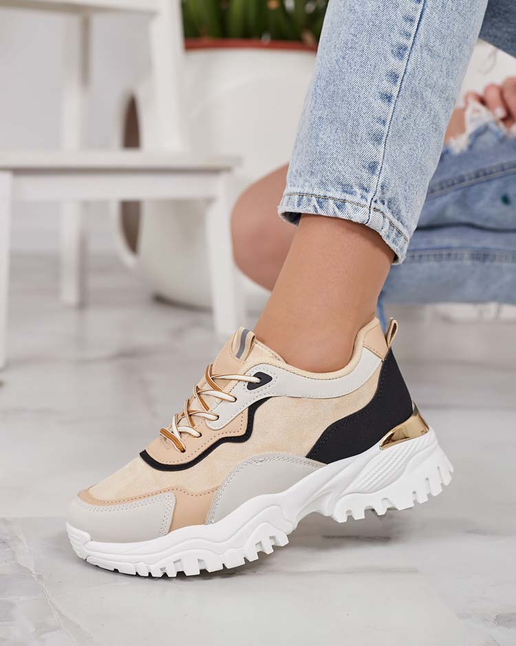 - Adidași de damă cu talpă plată - combinația perfectă de stil și confort. Încălțăminte confecționată dintr-o combinație de nubuc eco, piele eco și piele de căprioară eco. Model cu șireturi, are o talpă din material textil. Ideali pentru persoanele active!