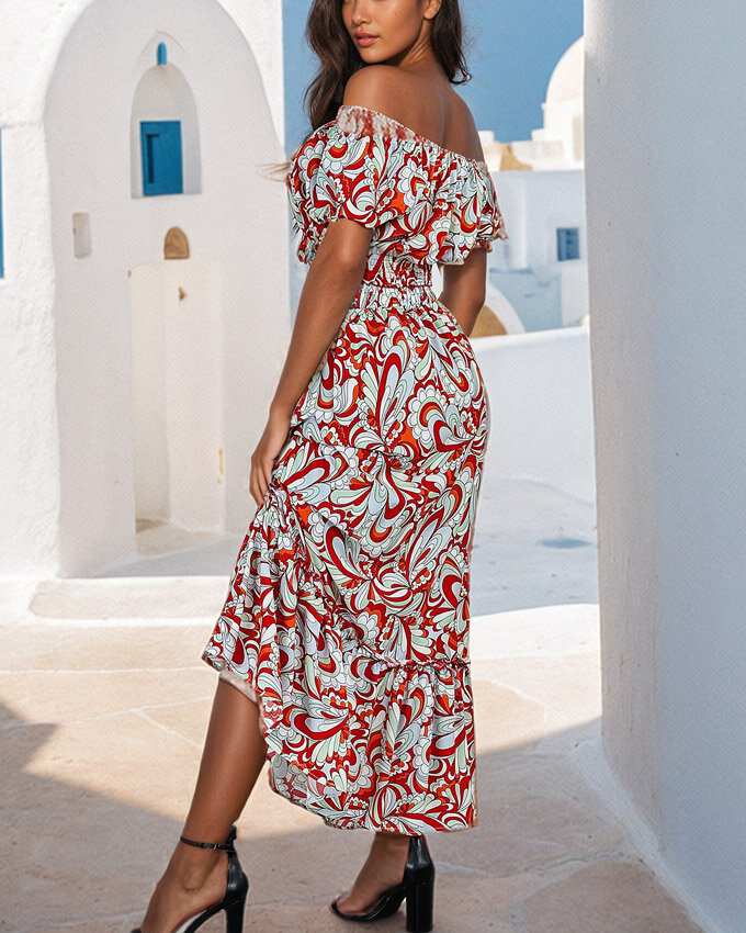 - Set de vară cu model pentru femei, realizat din material plăcut și ușor. Topul scurt în stil spaniol are un decolteu rotund și o talie elastică. Fusta lungă are o talie elastică și volane decorative. NOTĂ: Precizia măsurătorilor (+/-) 1 cm.