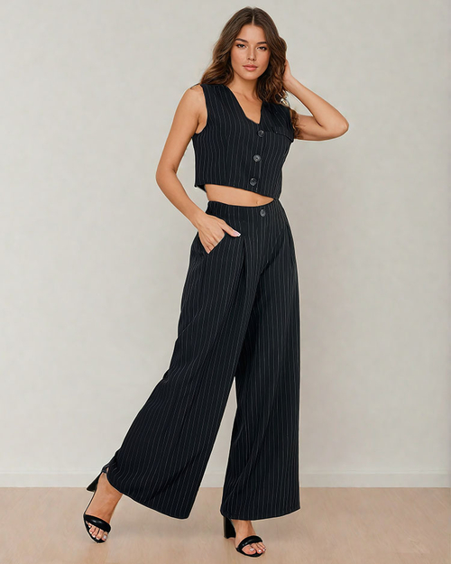 - Set elegant pentru femei din material plăcut. Vesta scurtă fără mâneci cu nasturi. Pantaloni largi cu talie elastică și 2 buzunare. Întregul set decorat cu un model cu dungi.