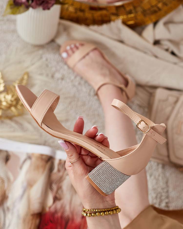 - Sandale Stiletto din piele ecologică și talpă din piele ecologică, închise cu o cataramă. Pantofii se află pe o montură confortabilă, decorată cu zirconiu cubic, ceea ce reprezintă un confort mult mai bun, iar catarama îi face ușor de pus.