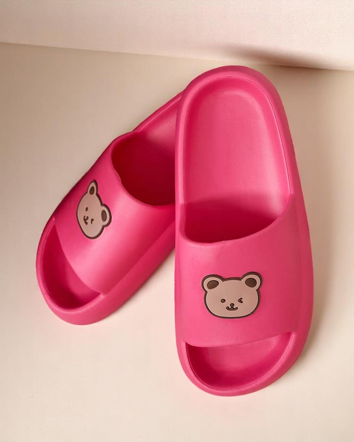 • Șlapi grozavi de cauciuc pentru femei, cu talpă plată, curea decorată cu un ursuleț drăguț de pluș. O alegere perfectă pentru vacanțe!