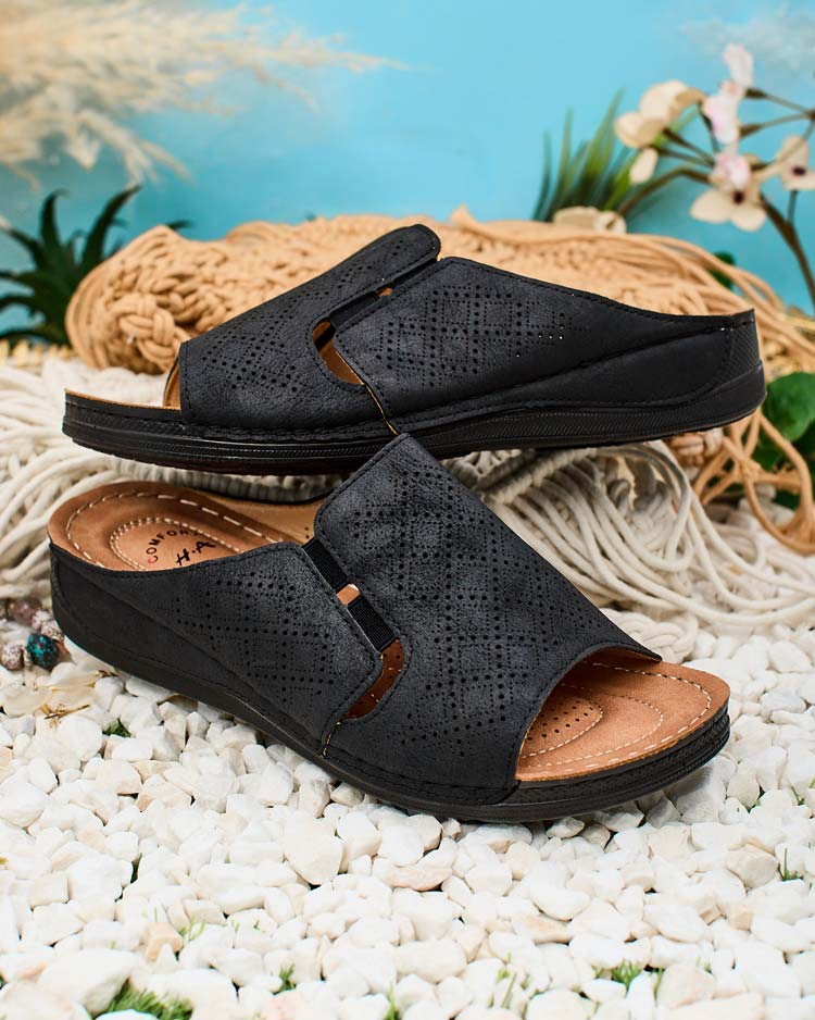 • Șlapi cu talpă plată grozavi pentru femei. Confecționați în întregime din piele ecologică. Au o parte superioară ajurată. O alegere perfectă pentru vacanțe!