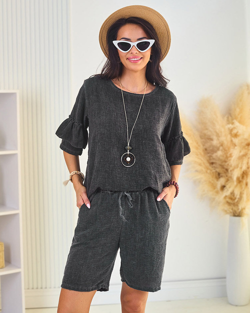 - Set pentru femei realizat din material plăcut. Bluză cu mâneci scurte decorative și pantaloni scurți cu talie elastică. În plus, un colier inclus în set. Simțiți vara în acest set minunat!
