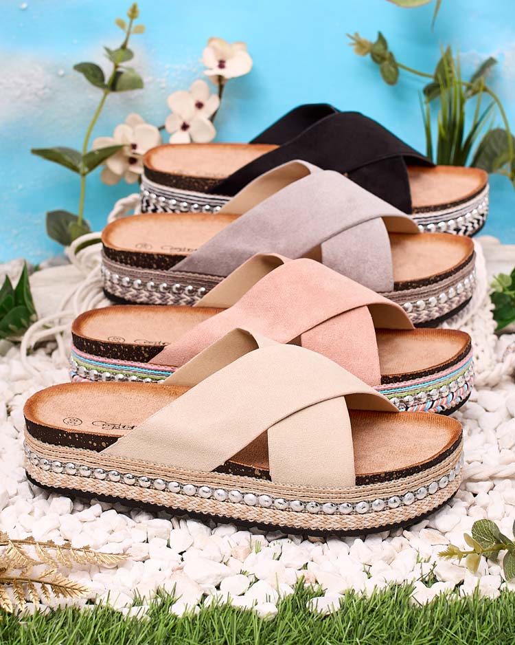 - Șlapi grozavi de damă cu talpă plată. Confecționați în întregime din piele ecologică de căprioară. Talpa decorată cu material a'la plută. O alegere perfectă pentru vacanțe!