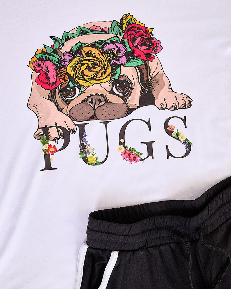 - Set pentru femei realizat din material plăcut. Modelul are un imprimeu cu un cățeluș. Bluză cu mâneci scurte și pantaloni scurți cu talie elastică. Simțiți vara în acest set minunat!