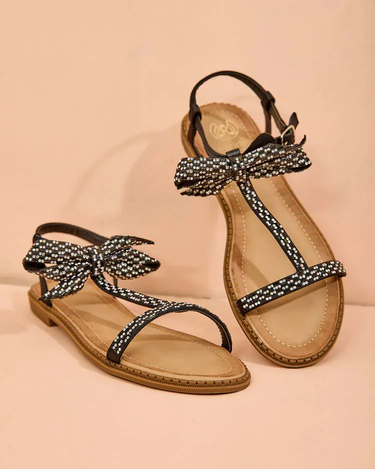 - Sandale plate la modă pentru femei, realizate integral din piele ecologică. Fixate cu o cataramă, partea superioară decorată cu o fundă subtilă care le adaugă subtilitate. Perfecte pentru plimbările de vară și ocaziile speciale!