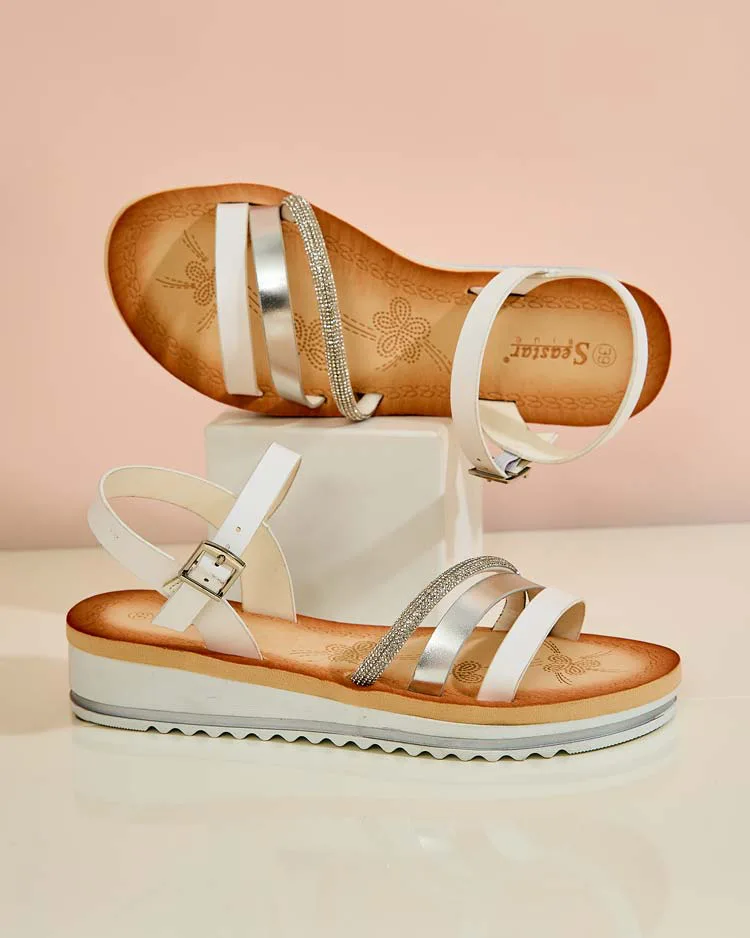 - Sandale de damă pe talpă plată - ideea perfectă pentru zilele toride de vară. Model realizat în întregime din piele ecologică. Partea din față decorată cu o curea elegantă cu zirconii, iar în jurul gleznei o închidere cu cataramă.