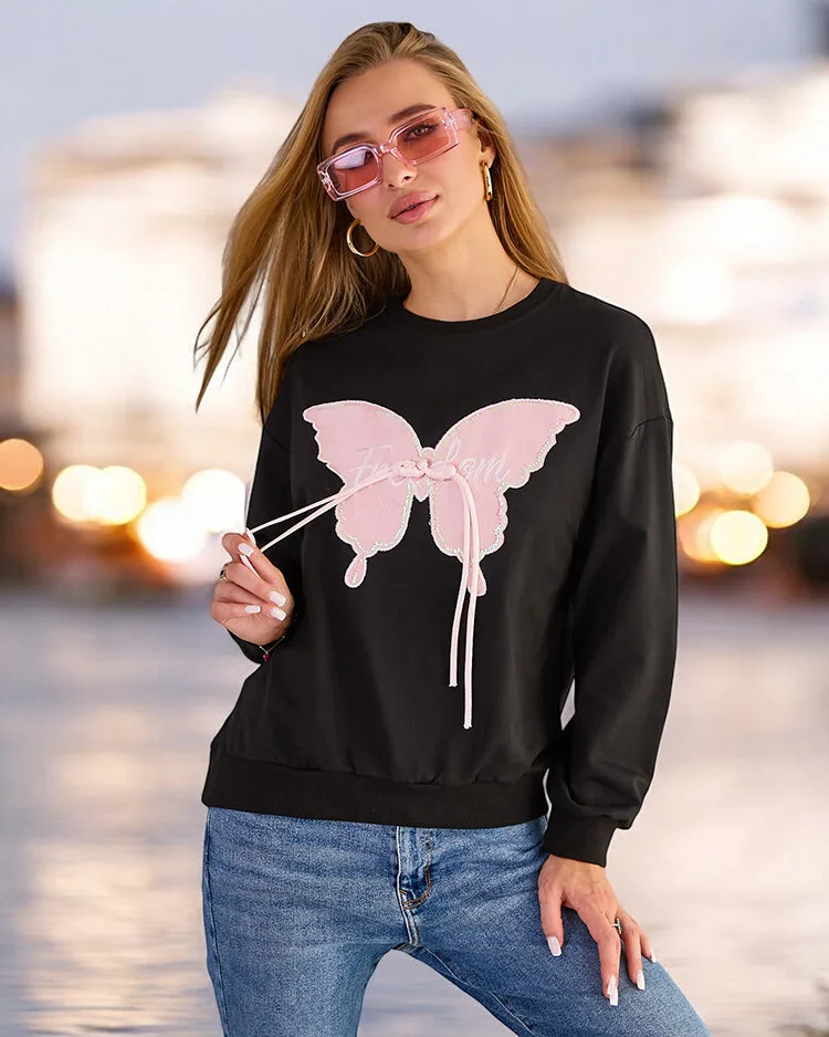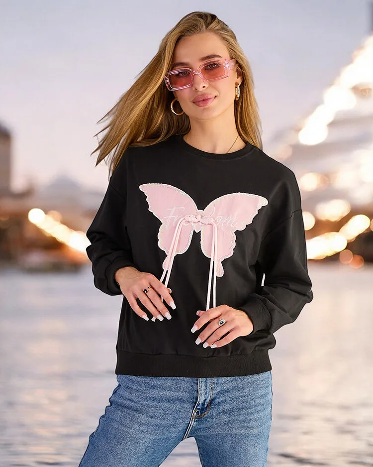 - Adaugă fler ținutelor tale cu hanoracul nostru subțire, împodobit cu un petic de fluture. Inserabil peste cap, cu un decolteu rotund și mâneci lungi. Perfect pentru fiecare zi când vrei să te simți casual, dar elegant!