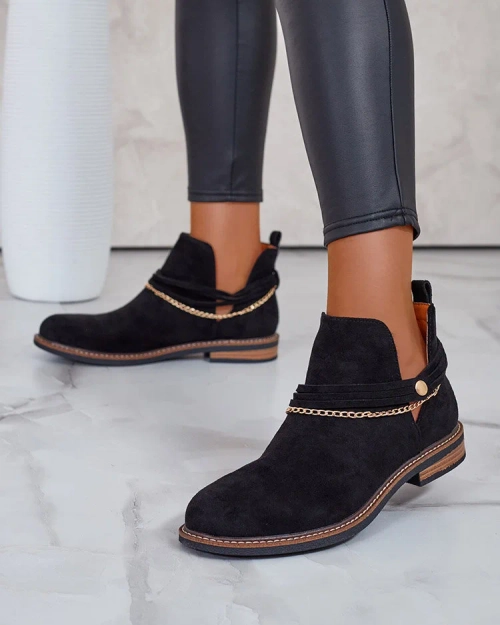 • Cizmele elegante pentru femei din piele ecologică cu talpă din piele naturală sunt ideale pentru zilele mai reci. Model slip-on cu lanțuri decorative pe partea superioară. Încălțăminte pe toc plat și cu vârf rotund. Super accesoriu pentru ținutele tale ca