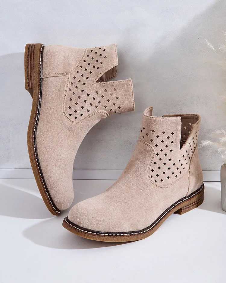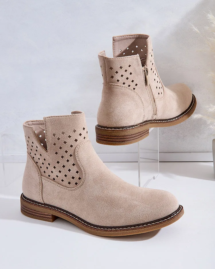 • Cizmele elegante pentru femei din piele ecologică cu talpă din piele naturală sunt ideale pentru zilele mai reci. Partea superioară este fixată cu un fermoar. Model pe toc plat și cu nas rotund. Super accesoriu pentru ținutele tale casual!
