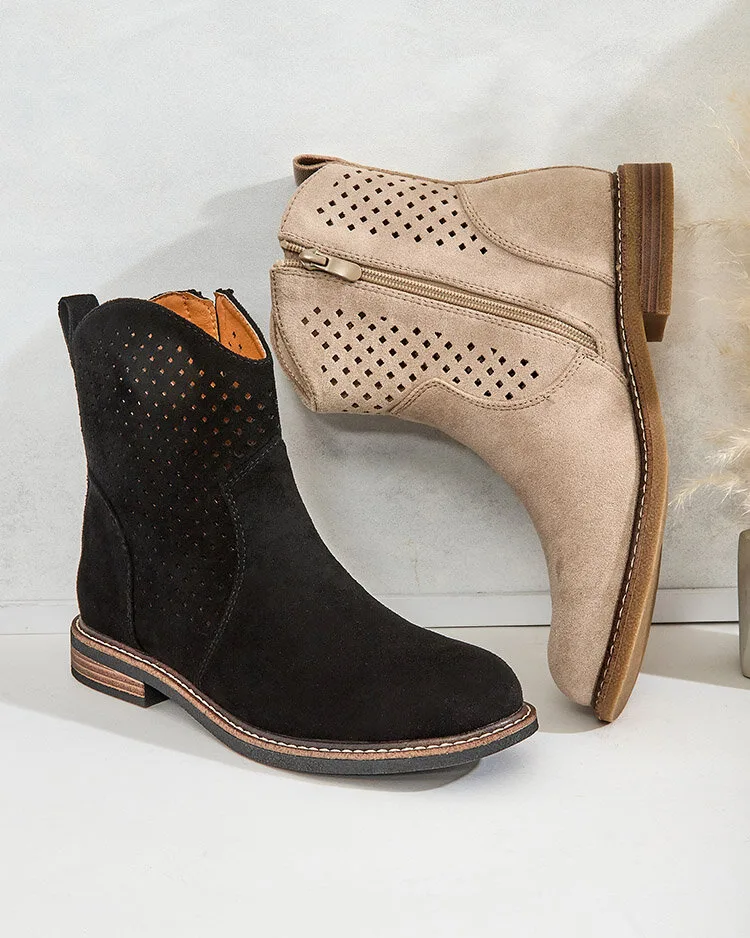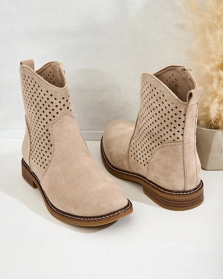 - Cizmele elegante pentru femei din piele ecologică cu talpă din piele naturală sunt ideale pentru zilele mai reci. Partea superioară ajurată este fixată cu un fermoar. Model pe toc plat și cu nas rotund. Super accesoriu pentru ținutele tale casual!