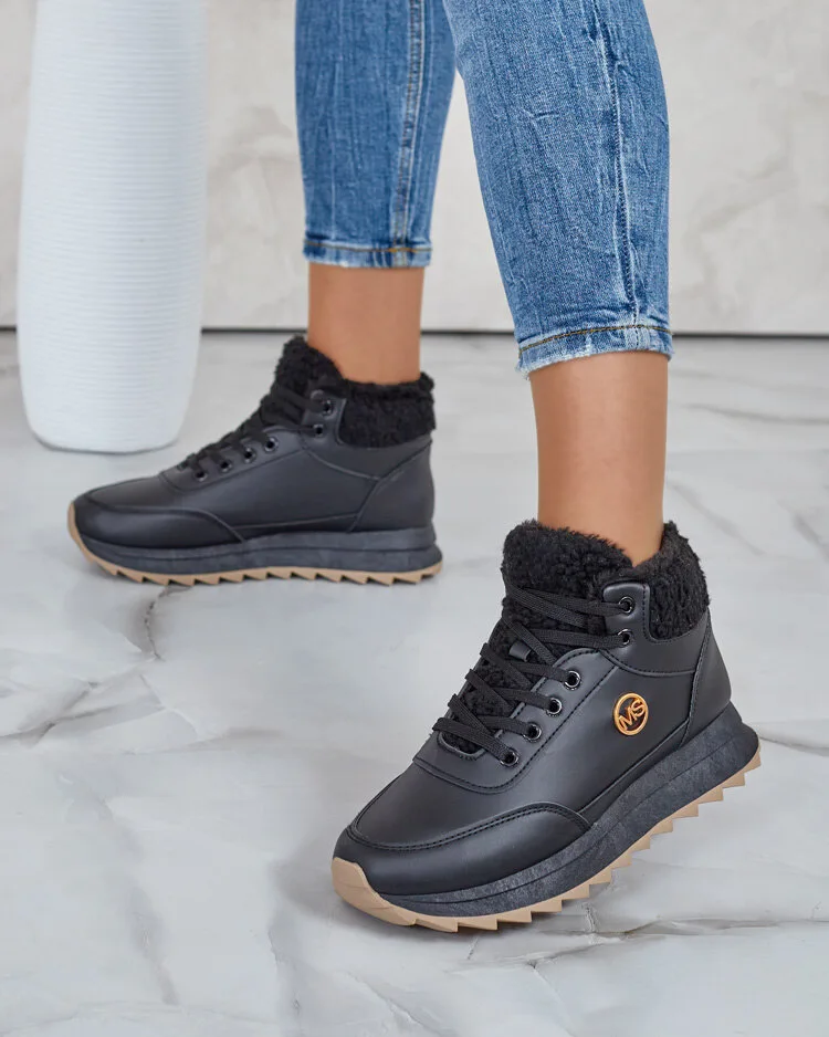 - Adidași sport de damă pe talpă mai groasă. Partea superioară cu șiret, confecționată din piele ecologică. Interior complet izolat cu blană. Ideali pentru zilele mai reci!